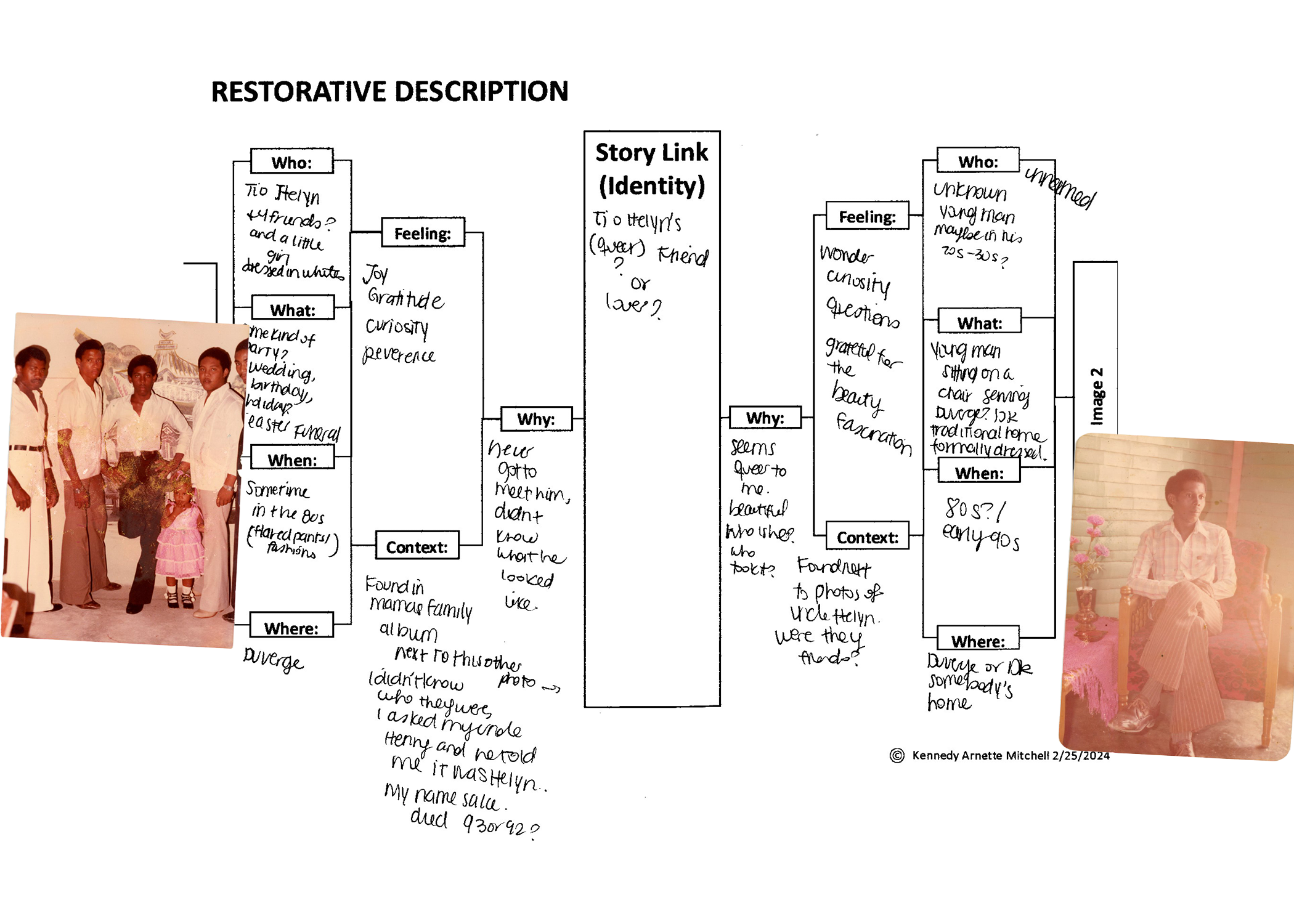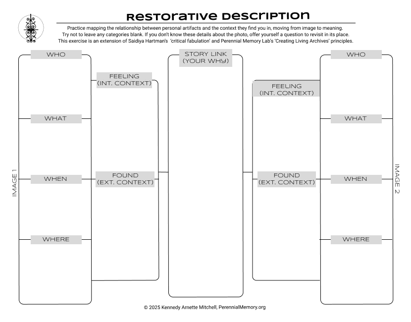 The title of this exercise, 'Restorative Description', alludes to the faulty logic of the former approach and a desire to return that descriptive authority to the subjects of our photos. What we're working to restore is your inner world and intuition. I hope this exercise helps to restore confidence in yourself as a storyteller, no matter your archival skill level. If generations of racist and exclusionary institutions felt emboldened enough to think they could tell our stories, we're overqualified for this work already.